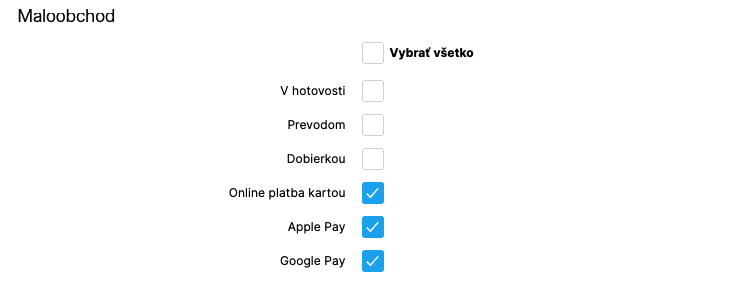 Automatické generování daňových dokladů se váže na platební metodu, kterou je daná objednávka zaplacená. Proto v seznamu zaškrtněte, u které platební metody požadujete generování daňového dokladu. V případě Shoptet Pay tedy vyberte metody: Online platbu kartou a Apple Pay tak, aby se k nim automaticky generovaly daňové doklady.
