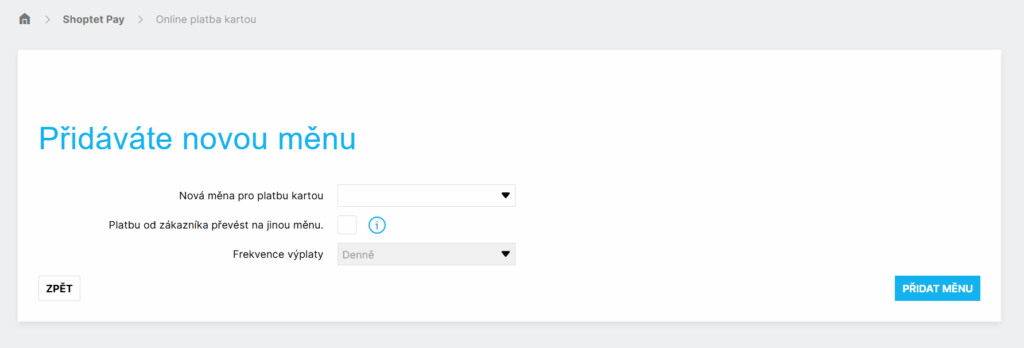 Pokud přijímáte platby v měně, kterou nechcete nebo nemůžete vyplácet přímo na svůj bankovní účet, můžete u této měny zapnout převod na jinou měnu výplaty. Při vyplácení pak Shoptet Pay automaticky převede přijaté prostředky do zvolené měny (typicky CZK nebo EUR), čímž se vyhnete poplatku za přeshraniční výplatu. Nastavení provedete při přidávání přijímané měny – zaškrtněte volbu Platbu od zákazníka převés na jinou měnu a poté zvolte cílovou měnu, do které se mají prostředky automaticky převádět. Podrobnosti o kurzech a případných poplatcích najdete v ceníku Shoptet Pay.