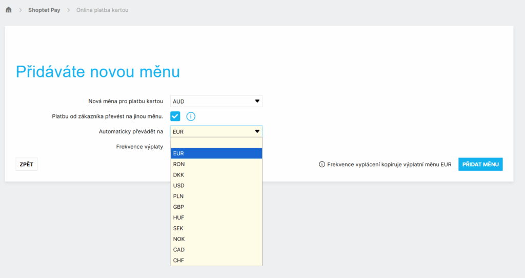 Ak prijímate platby v mene, ktorú nechcete alebo nemôžete vyplácať priamo na svoj bankový účet, môžete pri tejto mene zapnúť prevod na inú menu výplaty. Pri vyplácaní potom Shoptet Pay automaticky premení prijaté prostriedky do zvolenej meny (typicky CZK alebo EUR), čím sa vyhnete poplatku za cezhraničnú výplatu. Nastavenie vykonáte pri pridávaní prijímanej meny – zaškrtnite voľbu Platbu od zákazníka prevesť na inú menu a potom zvoľte cieľovú menu, do ktorej sa majú prostriedky automaticky premieňať. Podrobnosti o kurzoch a prípadných poplatkoch nájdete v ceníku Shoptet Pay.