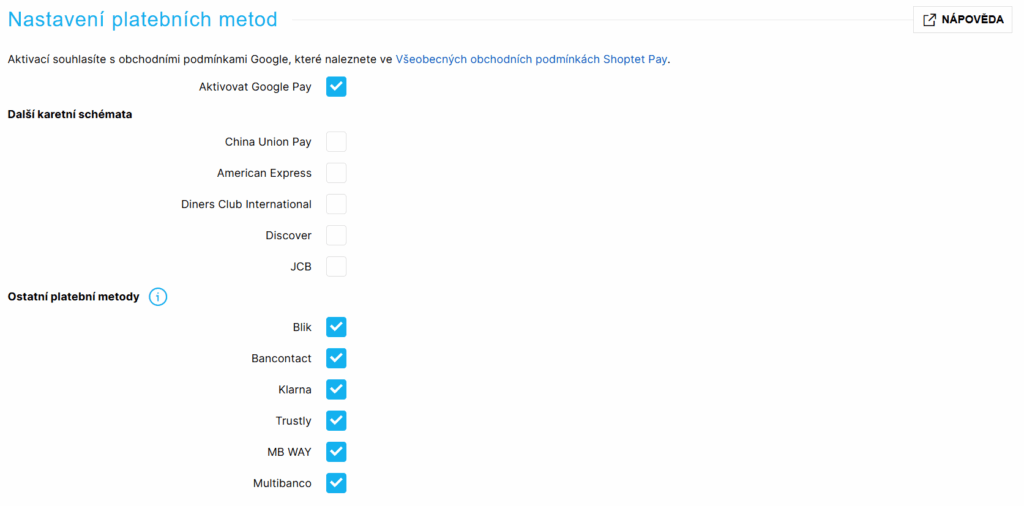 Jednotlivé platobné metódy môžete aktivovať ich zaškrtnutím v sekcii Aktivácia ďalších platobných metód.